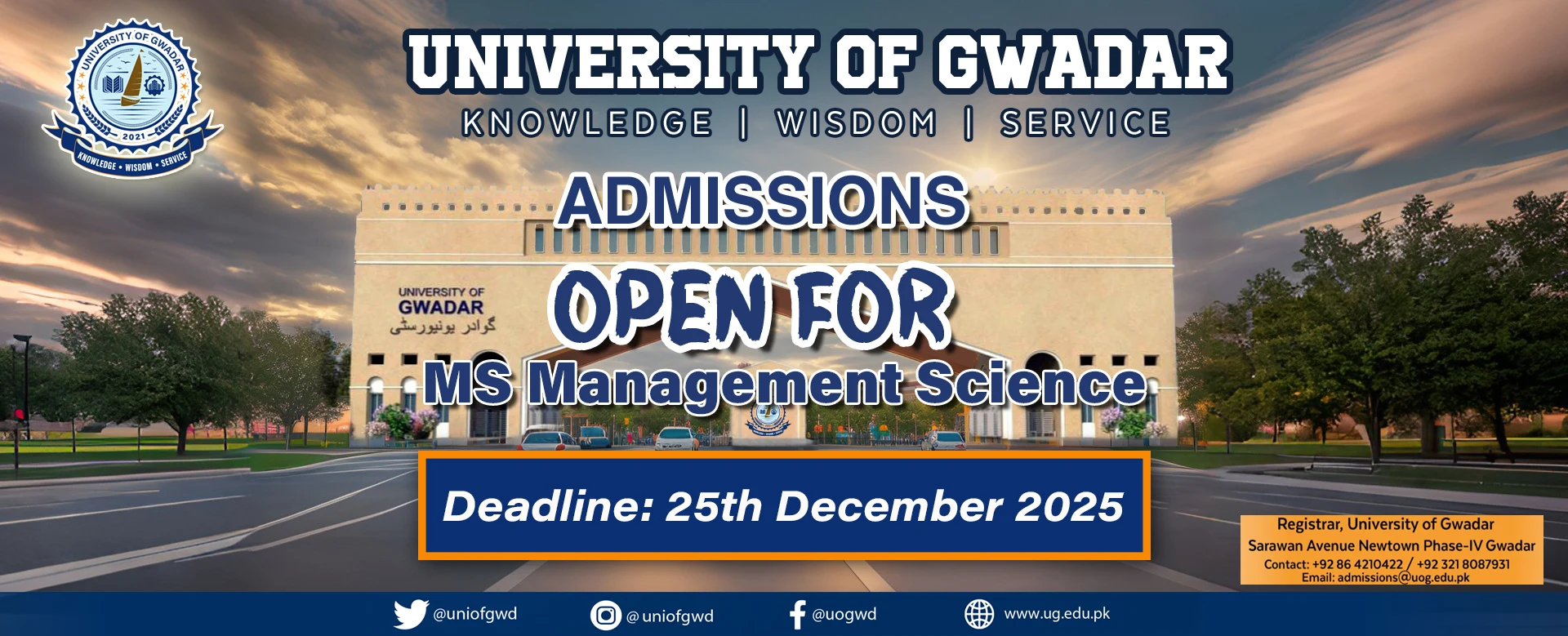 The mission of the University of Gwader (UG) is to be the leading university in the country and excel as a one-stop repository of research and development by distinguishing itself through innovation in modern pedagogy and the provision of world-class education. To be the first university in Balochistan that reflects an international range in its courses and program design.